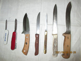 Egyébként a kések a családban mindig nagy figyelmet kaptak, néha családi perpatvar tárgyát is képezték. Édesapám késes-ollós cégnél dolgozott, s mivel a 60-70-es években még nem volt ilyen széles választék az üzletekben, a késeket a cégnél csinálta meg, a főnök engedélyével természetesen (az első tv-nk antennája is így készült). Nagyapám télen disznóvágásokon való böllérkedéssel foglalkozott, de abban az időben természetesen otthon is tartottunk és vágtunk disznót, mert ugye a húsellátás sem volt éppen kielégítő. S ha már disznóvágás, akkor kell oda mindenféle formájú kés, külön a szúráshoz, a kaparáshoz, a felvágáshoz, csontozáshoz és még ki tudja mihez. Külön késünk volt a kenyérvágáshoz, mert a húsos késekkel tilos volt a kenyérre menni. Nem akarom mondani, hogy kb. egy machete mérete volt, mert akkoriban még 3 kilós cipót sütött a pék, amit nem lehetett akármivel szeletelni. Voltak kisebb kések is a zöldségpucoláshoz, meg persze az étkezéshez. Szinte mindenkinek megvolt a saját kis kése, így aztán minden terítésnél lehetett morgolódni, ha más kés került a terítékünkhöz. Aztán volt néhány különlegesebb darab, bicska, agancsnyelű és társai.